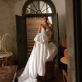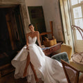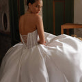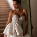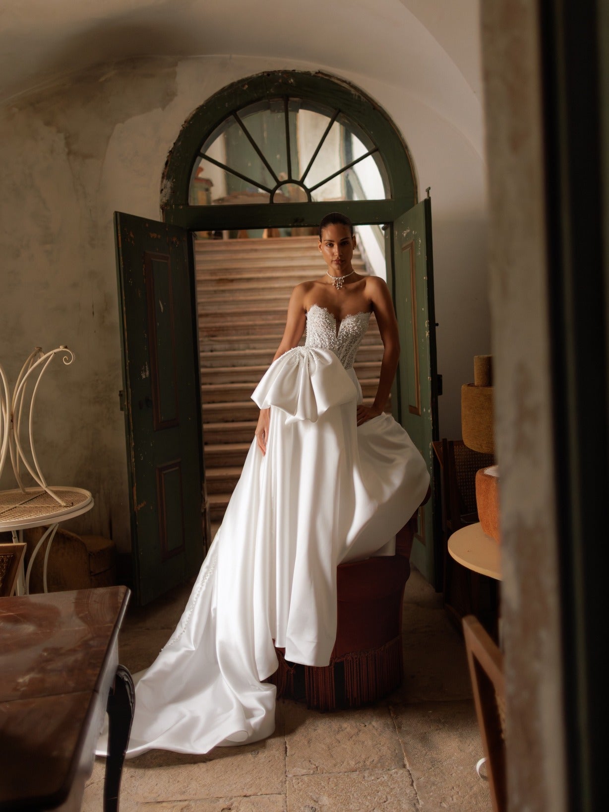 Abito da sposa dalla linea semi ampia romantico e sofisticato. Realizzato in mikado, il corpino è un gioiello: realizzato in pizzo con scollo a cuore e struttura a corsetto. Completa il look un fiocco rimovibile in mikado con inserti in perle. La schiena è chiusa a corsetto.