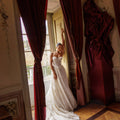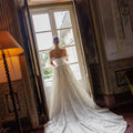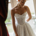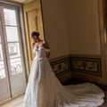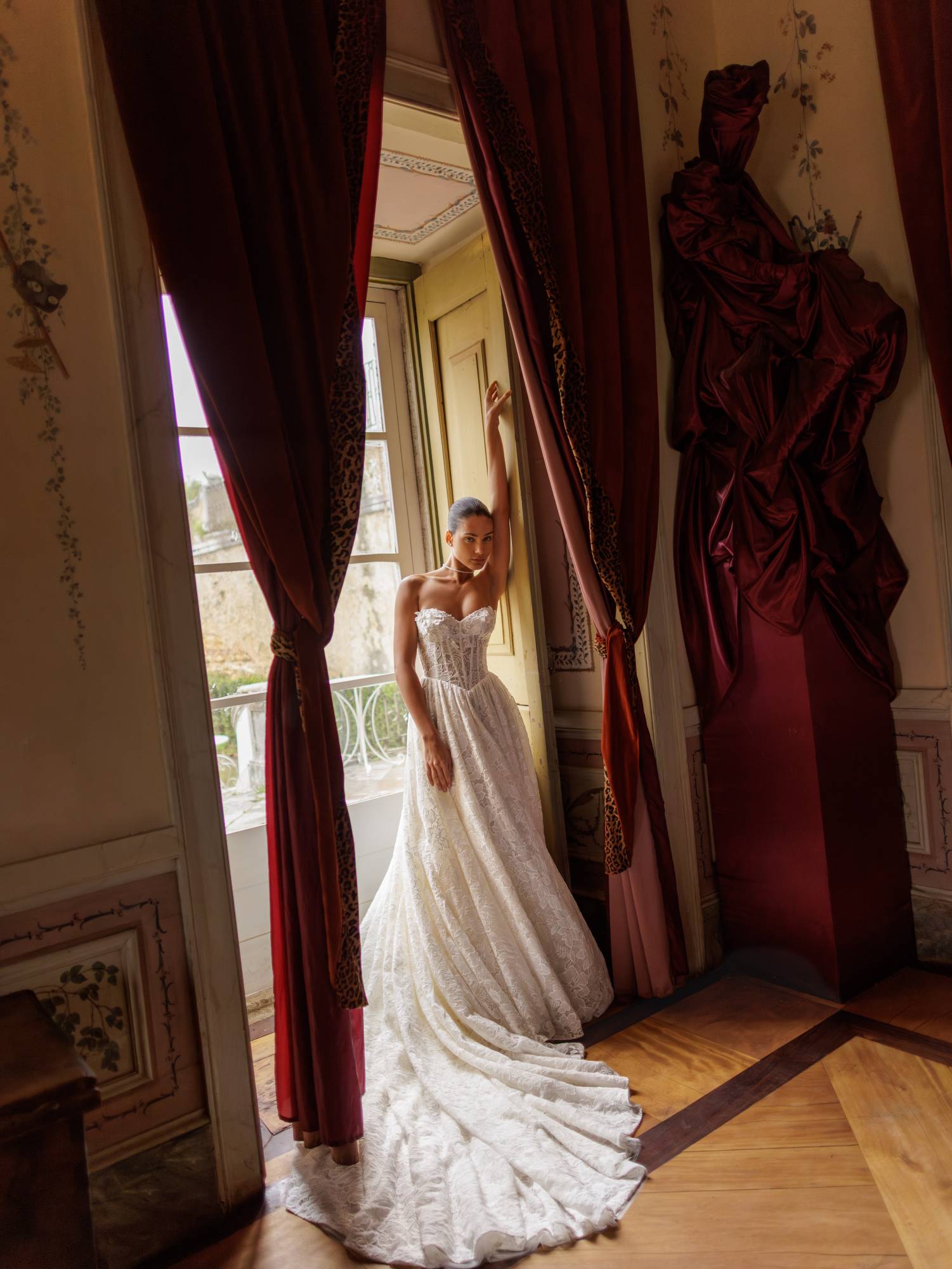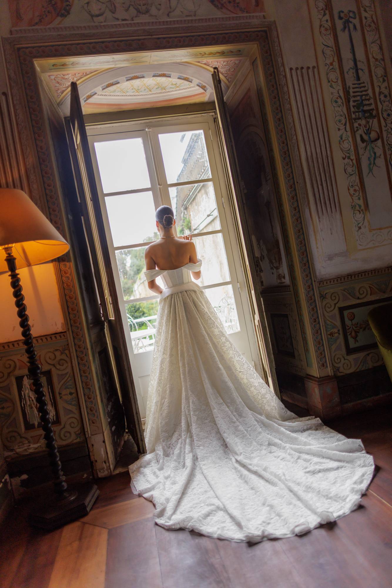Abito romantico dalla gonna ampia da principessa, realizzato in morbido pizzo con scollatura a cuore e applicazioni di pizzo tridimensionale sul corpino. Completa il look un corsetto con chiusura con lacci davanti, spalline omerali e baschina.