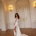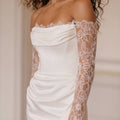 Abito in satin dalla silhouette a sirena con scollo omerale dritto, maniche lunghe in pizzo leggero e drappeggio sul corpino. L'abito presenta poi anche uno spacco sensuale.