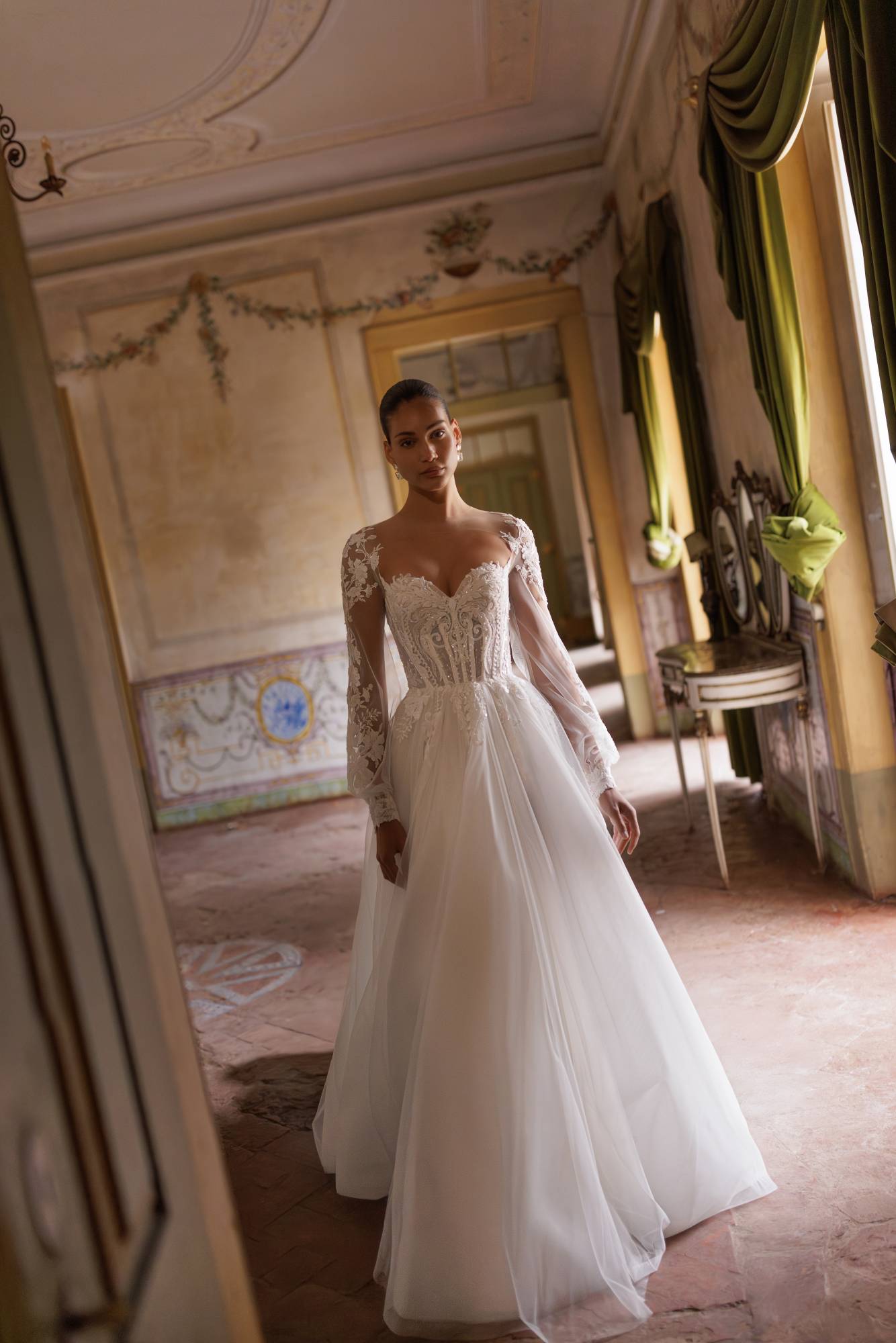 Abito da sposa ampio da principessa in tulle con corpino scollato a cuore realizzato in pizzo geometrico e ricamo luminoso. Le maniche morbide a sbuffo donano morbidezza e rendono l'abito sofisticato e femminile. La schiena, scollata, è chiusa con corsetto.
